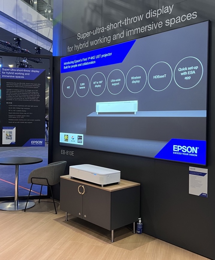 EB-810E, der erste 4KE Super-Ultrakurzdistanz-Laserprojektor von Epson für Unternehmen, hybrides Arbeiten und immersive Umgebungen